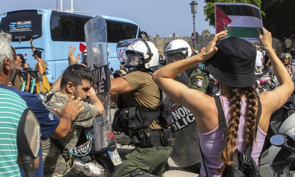 فلسطین میں اسرائیل کے جاری مظالم کے خلاف یونان میں احتجاجی مظاہروں کا سلسلہ شدت اختیار کرتا جا رہا ہے۔ اس دوران، اسرائیلی کروز شپ “ایئر کراؤن” کے سیاحوں کے خلاف جزیرے رودس پر مقامی عوام نے بڑے پیمانے پر مظاہرہ کیا۔